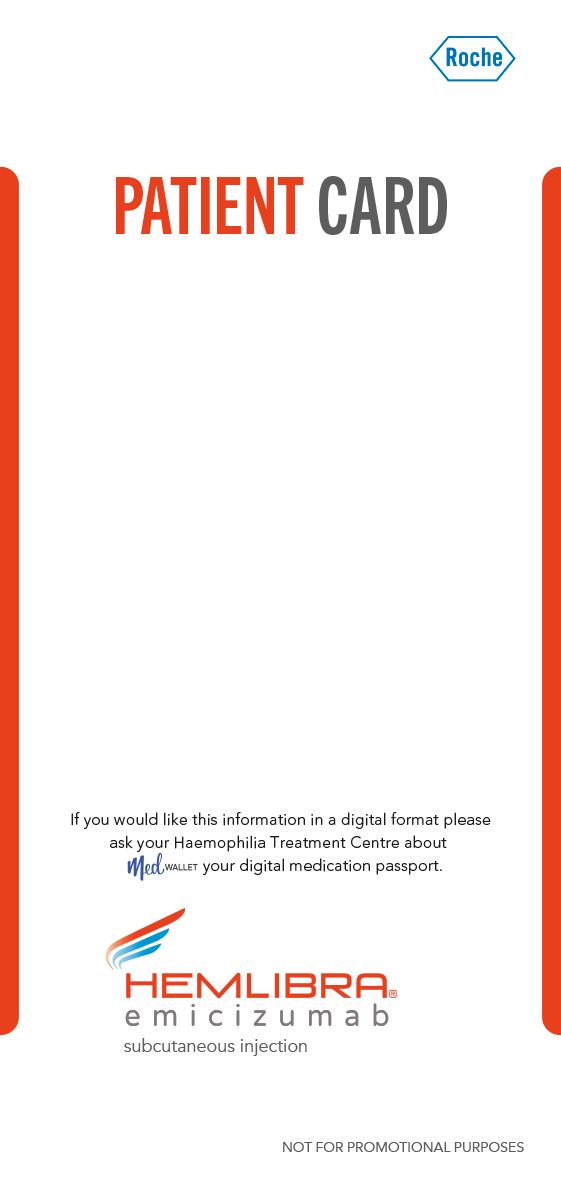 Please present the card at visits to doctors, hospital clinics, laboratory professionals or pharmacists to provide information on HEMLIBRA treatment and risks. If you would like this information in a digital format, please talk to your treatment centre about