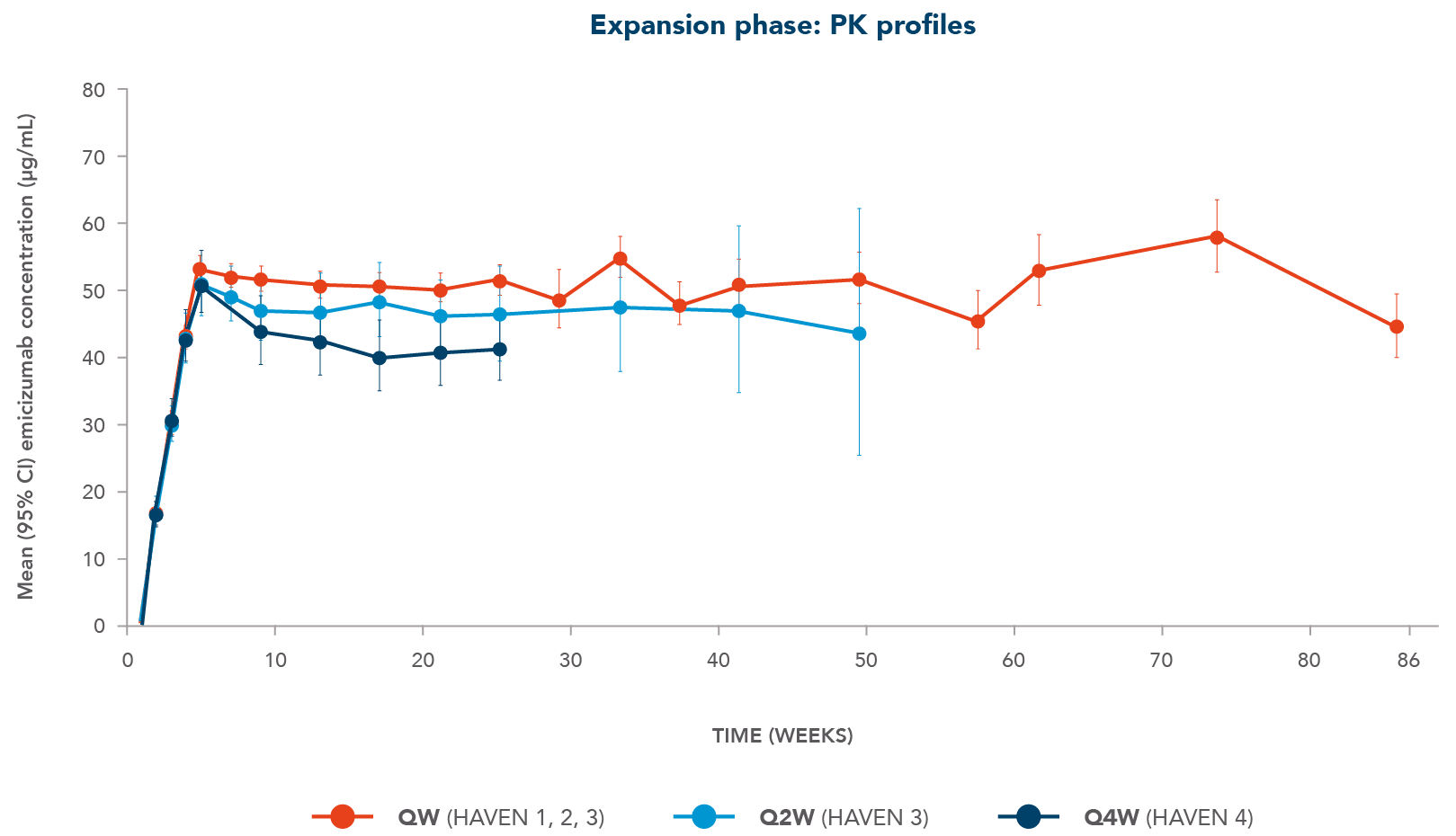 - For Q4W, emicizumab mean trough concentrations were maintained at ~41 µg/mL from Week 13 to Week 25